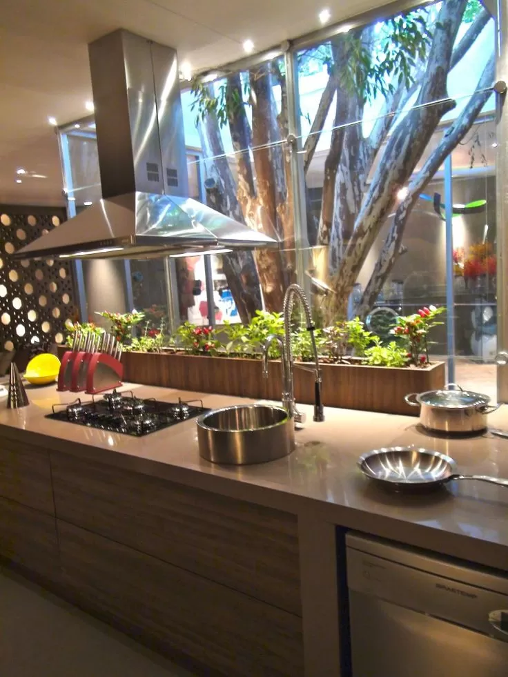 Esse é um típico exemplo de uma ilha que possui várias funções. Ela recebeu cooktop, pia, gavetas, máquina de lavar louça e uma bancada espaçosa para colocar utensílios de cozinha e dar apoio para o preparo de alimentos. Além do mais, possui um nicho para uma pequena horta, com temperos e hortaliças frescas, para ser serem usados na hora de cozinhar. Tem coisa melhor?