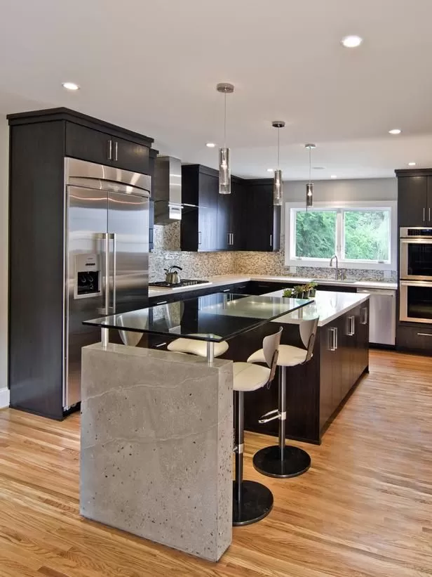 Olha que charme essa cozinha! Veja que nesse exemplo a ilha não foi projetada para embutir o fogão e uma pia. Se o morador não quiser ou, caso não tenha espaço, não é uma regra utilizar a ilha para embutir esses itens e outros eletrodomésticos. Aqui ela foi usada como bancada para auxiliar na preparação dos alimentos que não precisam de fogão, para receber armários (em baixo) e como apoio para a mesa. Note que o vidro harmonizou com a decoração e “quebrou” o tom escuro usado nos armários. O vidro é uma “peça coringa” neste caso, pois sua transparência foi bem aproveitada no ambiente que já tem os eletrodomésticos em inox e o chão mais escuro.