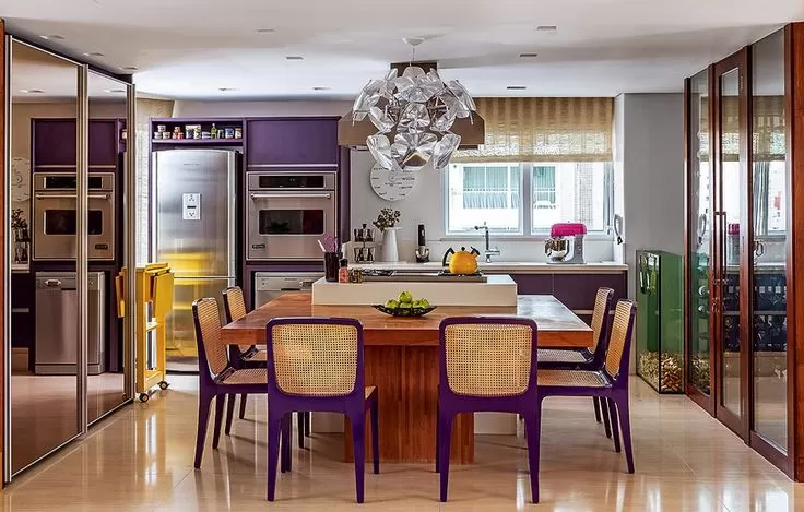 O colorido desta cozinha foi bem harmonizado com a madeira usada na bancada, além do vidro e espelho usados nas portas dos armários. O uso de espelhos traz sofisticação ao ambiente. Essa ilha espaçosa foi escolhida para ser a base da mesa e também do cooktop. Uma combinação perfeita para reunir a família e amigos por longas horas ao redor do fogão. A neutralidade do piso casou com as cores dos móveis e cadeiras, deixando o ambiente moderno e ao mesmo tempo alegre!