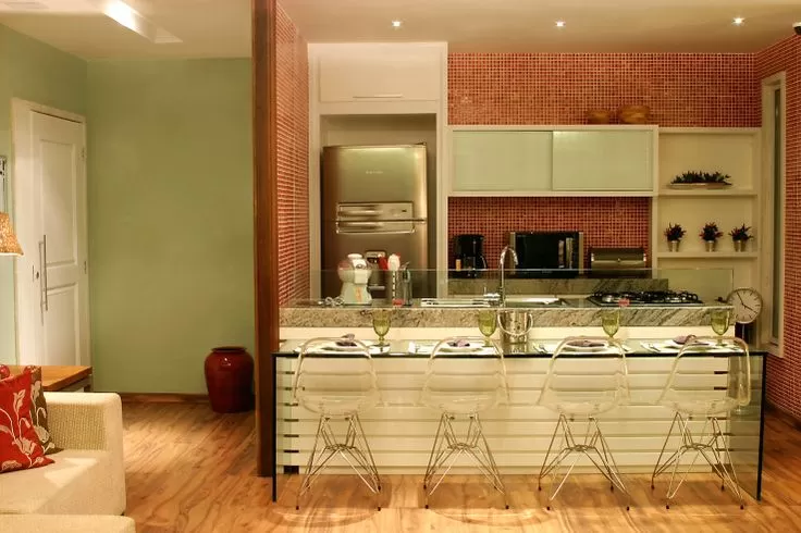 Esses dois modelos de cozinhas trazem ilhas que aproveitam o vidro como mesa de apoio. Não importa as cores ou as texturas usadas na decoração, o vidro é versátil e combina com qualquer estilo. Além da neutralidade, é prático e fácil de limpar.