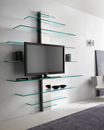 Os reflexos de livros, objetos de decoração e até mesmo garrafas de bebida dão um toque especial a qualquer ambiente. Experimente adicionar uma pequena lâmpada no fundo da prateleira para um efeito ainda mais original. Alguns decoradores intercalam prateleiras de vidro e prateleiras de madeira, principalmente em quartos e home offices, onde é necessário um número grande de apoios para papeis, livros, roupas, entre outros objetos.