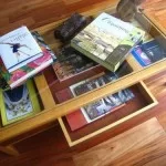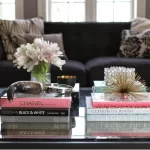 Se você quer dar destaque a alguns modelos com capas chamativas ou formatos diferentes, coloque-os em cima de uma mesa de centro com tampo de vidro. Decoram e ainda são um atrativo para os convidados folhearem suas páginas.