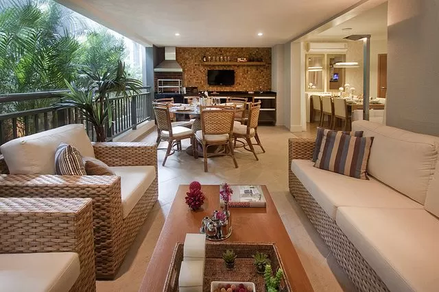 Existem varandas em apartamentos que deixam a gente com vontade de ficar lá e não sair mais! Uma das ideias mais interessantes é integrá-la com a sala de jantar. Nessa varanda abaixo, o proprietário abusou do espaço amplo e criou uma área convidativa para momentos de lazer e descontração. Seguindo uma linha clean com toques rústicos, a varanda tem espaço suficiente para uma pequena cozinha, mesa, sofá e poltronas. Os móveis feitos em fibra sintética com cores claras é um convite para o descanso. Com um grande vão entre a sala de jantar e a varanda, é possível reunir todos durante as refeições.