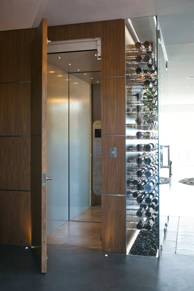 Temos na foto uma adega totalmente visível a metros e mais metros de distância. Isso se dá porque toda a sua estrutura é feita de vidro. Além de apresentar um toque moderno, nota-se que pode ser mais viável elaborar uma estrutura assim em vidro do que madeira nobre. Combinar orçamento baixo e algo moderno não é excelente?